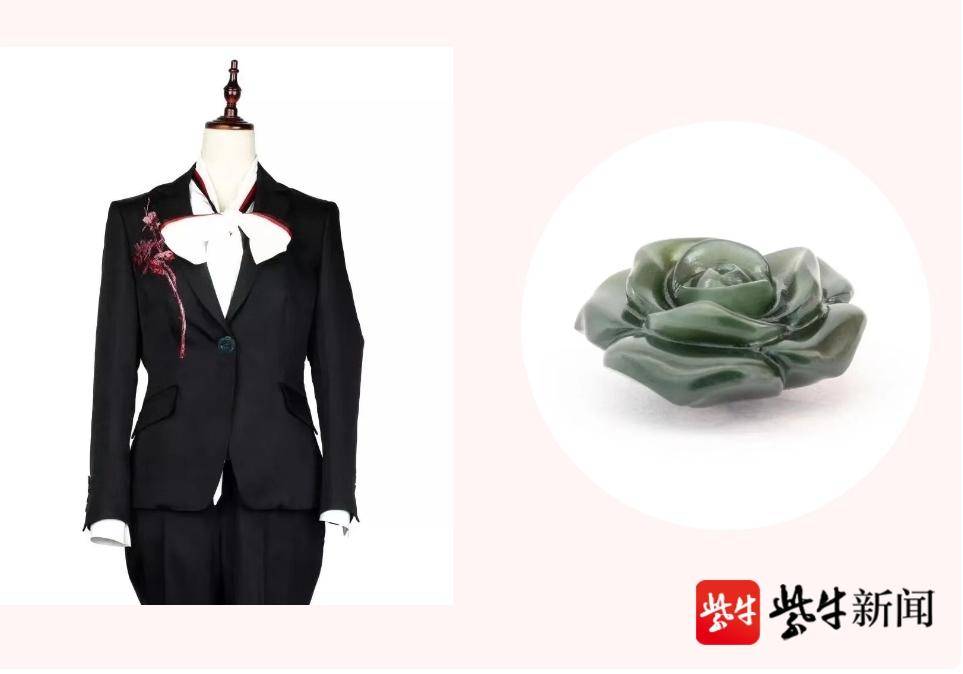 礼服上一朵朵精致的“玉雕玫瑰”纽扣,由光福镇玉雕品牌于生一国玉天工(苏州)数字科技有限公司联合玉雕大师朱阿多操刀设计,集光福镇数十位玉雕匠人合力在短时间内完成。这也是继今年初于生一国玉天工联合苏州博物馆推出2022年春节贺岁祥瑞福象网红产品后,又一惊艳走红的玉雕爆款。