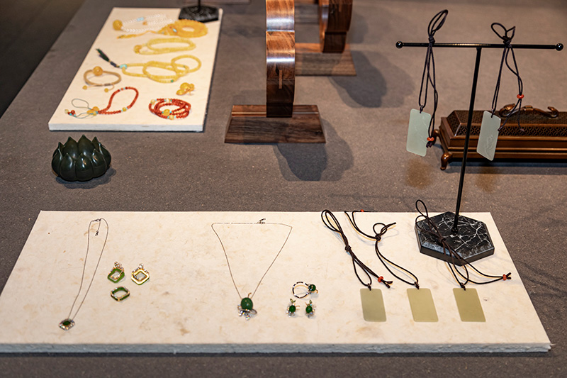 “于生一”参展作品为和田玉雕刻的精美玉雕书签,以及用金、玉、钻石镶嵌的“锦瑟年华套装”、“柠檬半夏套装”等。