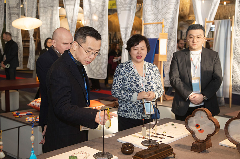 当地时间1月20日,中国驻法大使卢沙野一行到访“宅兹中国馆”,卢沙野大使认真参观并对参展作品称赞不绝,在苏州玉雕展台前更是多次驻足。